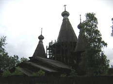 Уникальная трехшатровая композиция с общей большой трапезной. Центральный шатер уже давненько в лесах, но в целом состояние вполне приличное и годное для обозрения с удовольствием. Рядом выдержанная в том же стиле часовня. Всё это на берегу бурной реки Кемь, что добавляет эффекта.
