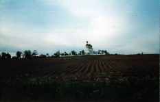 Издалека лучше, чем в упор, ибо расположен на небольшой возвышенности посреди полей, но вблизи тоже хорош. Собственно, это целый комплекс с оградой, воротами, подсобными строениями – небольшой кудрявый городок сам по себе.