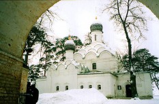 Дивное кудрявое творение за мощной стеной (и ворота тоже неплохи) на краю усадьбы Юсуповых (см.). Присутствует на планах усадьбы, построена при прежних хозяевах - Одоевских. Действует.