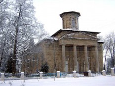 Аналог гатчинской (желтый камень, портик), но раза в два больше - прям Парфенон какой-то. Не действует, предпринималась попытка реанимации - леса уже сгнили.