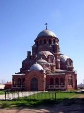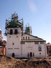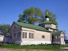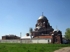 Не поражает красотой построек: старая деревянная Троицкая церковь – ровесница Свияжска – сильно перестроена, каменная Сергиевская, построенная псковскими мастерами в 1604 г. - в лесах. В панораме видна только византийская Скорбященская церковь, но мне этот стиль не близок.