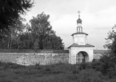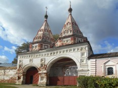 Мощный собор отреставрирован, очень хорош. Высокая классицистическая колокольня с аркой неимоверной высоты (можно въезжать на жирафах), за аркой (снаружи) – здоровый бронзовый Ильич с протянутой рукой (типичный соцарт). На колокольню за малую денежку можно подняться – и весь Суздаль как на ладони, никуда ходить не надо… Внутри стен несколько зданий общественного назначения (быв. кельи). Замечательные Святые ворота – изюминка ансамбля (ну не колокольня же?).
