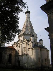 Духовская – помпезный классицизм, больше о ней ни слова. А Смоленская – дивная шатровая церковь 16 в., пытались её изуродовать пристройкой длинной трапезной и колокольни – всё же до конца не вышло. Деревья удачно растут так, что можно оставить себе в поле зрения шатер, а остальное исключить.