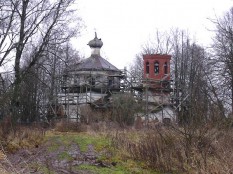 Церковь, по-видимому, была при усадьбе - маленькая, для своих. Сквозь сплошные строительные леса формы угадываются с трудом.