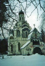 Построена учеником Васнецова С.Ватковым в оттяжно-псевдорусском стиле (удовлетворены самые смелые фантазии). Как единственный образец - очень хорош. Внутри, несмотря на пустоватость (перед 1917 его не успели расписать), очень необычно - как внутри ракеты на старте:-). Подобного (по конфигурации) внутреннего объема я нигде не встречал...