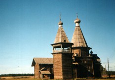Образцово-показательная деревянная церковь – полное впечатление, что реставрировали её для туристов. В Каргополье много хорошей деревяни, но экскурсионные автобусы ходят именно сюда. Церковь хороша, но простовата; обратите внимание на декоративные барабаны – это изюминка!