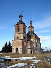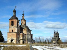 Замечательный, что редкость, ансамбль кирпичной и деревянной церквей. Вроде и консервация проведена – но… свежегоревшие перекрытия трапезной в каменной церкви, сломанный громоотвод в деревянной… Водичка течет с крыши в подвал, грозы бушуют – спешите видеть. Кстати, окружен ансамбль пихтовым лесом – кому-то привычным, но для меня – нечастое явление.