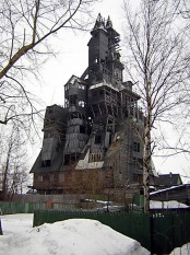 Зловещее сооружение в Соломбале, деревянный недострой в 13 этажей, затеянный местным бизнесменом-романтиком в романтические 1990-е годы. Боюсь, что его уже нет – зарегистрировать здание так и не удалось, а тендер на демонтаж, сулящий неслабые деньги, давно проведен. Фото, конечно, не передает размаха этого проекта, затеянного среди одноэтажной застройки, но если бы это упало, пострадало бы несколько кварталов… (Обновление от 2012: да, уже снесли, а остальное сгорело).