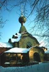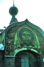 Из вариантов, предложенных Коровиным, Рерихом, Малютиным и др. выбран наиболее сдержанный (остальные - вовсе за гранью разумного). Получилось любопытно, но, конечно, на "возвращение к корням" не тянет - ХХ век налицо. Великолепный мозаичный Спас над входом (работа Рериха). По-видимому, благодаря разыгравшейся фантазии авторов, никогда не была освящена.