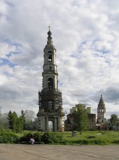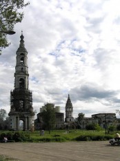 Церкви обгрызены до куба, но знаменитая колокольня ростом в 94 м, к счастью, жива. Один из средних ярусов в лесах (похоже, давно - они присутствуют на большинстве фотографий), вход заперт и не у кого спросить... Петропавловская церковь – традиционная ярославская, со своей шатровой колокольней, но на фоне вертикали теряется.