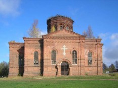 Неординарное решение - церковь обита листовым железом. Есть мнение, что это символизировало богатство прихода, ибо сохранности здания никак не способствует. Мне это не понравилось, хотя формы неплохи, а шатер очень хорош. Может, кому-то и придется по душе... Рядом - краснокирпичный храм, видимо, начала ХХ в., в заброшенном состоянии.