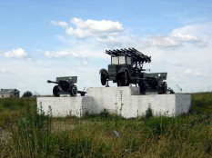 Бронепоезд (точнее, состав военных лет) – у вокзала, катюша и орудия – в степи на выезде в сторону Тулы. Особенно хорош памятник в степи – говорят, его перенесли с городища, и это правильно, здесь он адекватнее (даю его координаты, координаты вокзала см. в Гражданской застройке Мценска).