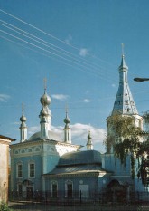 Старообрядческая, очень вычурная, с шатровой колокольней, стоит как-то боком к окружающей среде и приковывает взгляд. Рядом – скульптура неизвестного мужика с гуслями.