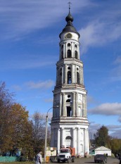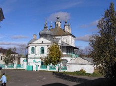 Довольно необычный храм с верандами-гульбищами по второму этажу – дикого винограда не хватает, почти летний ресторан. Ампирная колокольня с часами дополняет картину – всё разностильно, но приемлемо. Рядом ещё две церкви, занятые каким-то производством и утратившие почти все отличительные признаки – Казанская и Рождества Христова.