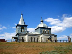 Довольно странно встретить в степи деревянную церковь, да ещё и оббитую местами железным листом. Если это демонстрация зажиточности прихода, то странная, всё равно выглядит неуклюже.