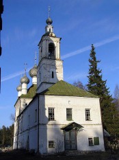 Действительно, в бору – от Архангельского погоста ничего не осталось, кроме этой кладбищенской церкви. Архитектурные достоинства средние (особенно неказиста, хотя и велика, колокольня, притом, что есть ещё колокольня, встроенная в храм), но явление её среди густого леса впечатляет.
