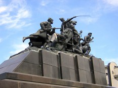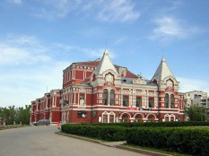 Несколько аляповатый театр (эклектика, ретро-стиль) охраняется лихой конницей Василия Ивановича – я за театр спокоен, не то, что за филармонию (см.). А с площади открывается чудный вид на промарх и Волжский утес.
