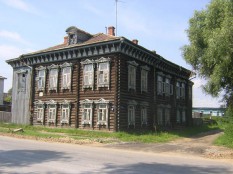 Стая монументальных зданий в нижнем городе: торговые ряды, девичье приходское училище, в котором можно хранить самолеты, палаты купца Володимирова, сильно закрытые деревьями. Дом-дворец Корнилова, к сожалению, укутан сеткой - опять ремонт. А здание превосходное. В кварталах деревенской застройки встречаются изумительные по красоте деревянные дома. Нижний город заселен в основном татарами, характерный признак - почти полное отсутствие зеленых насаждений. За заборами что-то растет, на улицах же - пусто. Не принято, видимо.