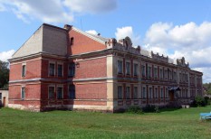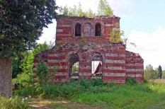 Развалины церкви в русско-византийском стиле и вполне ухоженный келейный корпус, используемый в каких-то казенных целях.