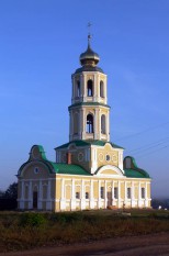 Абсолютно нетиповой симметричный храм иже под колоколы, опоздавший лет на 100. Видимо, прихоть помещика. Похож, скорее, на ратушу или вокзал, чем на православную церковь.