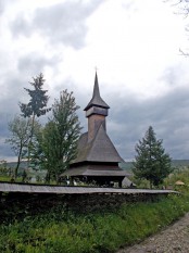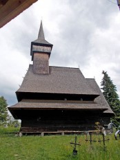 Вероятно, самая распространенный тип марамурешских деревянных церквей – крыша алтаря с одним карнизом, а остального здания – с двумя. Первоначальный замысел (два карниза по периметру в более старых церквях) упрощается, зато удлиняется шпиль. Похоже, здесь – прототип всего этого направления. На кладбище много красивых резных крестов, не столь давнего времени.