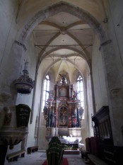 Вероятно, когда-то и она была церковью оборонного типа, но сейчас выглядит как заслуженная старинная кирха – большие окна, роскошный портал… Самое любопытное – внутри: автор лепнины изобразил в библейских сценах языческих персонажей, а некоторые фрагменты украсил неявными портретами заказчиков и своими. Можно соревноваться – кто сколько найдет.