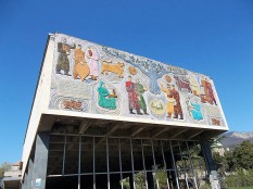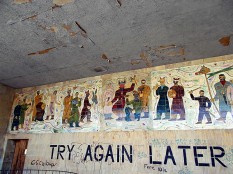 Заинтересовал меня этот заброшенный объект тем, что построен он на древних городских воротах, часть которых законсервирована внутри здания. Ворота оказались невразумительными, а мозаика на фасаде и втором этаже без признаков соцреализма – очаровательна.