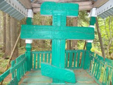 В часовне есть некая оригинальность, а деревянный с резьбой поклонный крест – ровесник часовни, стоящий рядом под сенью, вообще уникален. Каменные – да, встречаются, а деревянных в этих местах не припомню.