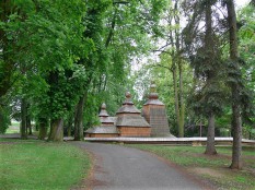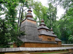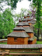 Привезена из Словакии, нормальная русинская церковь. Первоначально построена в 16 веке, кое-где им и датируется. Однако, есть мнение, что несколько раз была уничтожена полностью по разным обстоятельствам, и то, что сейчас видим – всего лишь столетней давности.