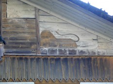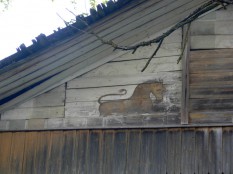 Среди старых, но вполне обычных изб есть один дом с сохранившимися наружными росписями – конечно, лев и единорог.