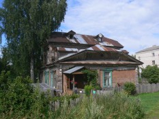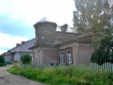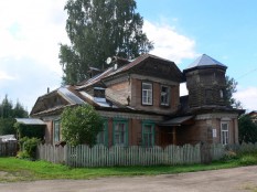 На охранной доске назван домом с трехъярусной башней, но верх башни недавно рухнул, на его месте построили скворечник из бруса. Неказисто, зато безопасно.