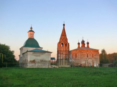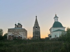 Церкви Воскресения Словущего (1698) и Космы и Дамиана (1789), между ними – шатровая колокольня, изрядно наклонившаяся. Состояние так себе, но общий вид очень неплох.