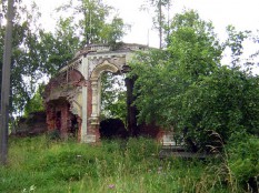 В бывшей усадьбе, на месте которой гордо торчит вышка Мегафона. Церковь была, судя по останкам, весьма изысканной, но взорвана (на кирпич?), обломки до сих пор лежат у подножья.