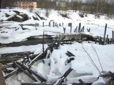 По тихвинской традиции, недавно горел, но, похоже, уже был в плачевном состоянии. Пешеходный мостик висит прямо над бывшей плотиной.