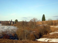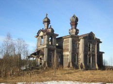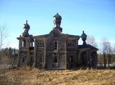 Храм несколько легкомысленного вида - похоже, за образец взяты дачки на Финском заливе. Брошен, разрушается, перспективы, на мой взгляд, отсутствуют.
