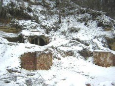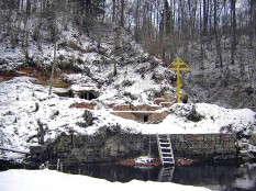 От церкви остался фундамент и вход в крипту-пещеру. Пещерка небольшая, с лужей и летучими мышками, дальше - завал. Прямо над пещеркой - обнажение, выше - остатки городища Доложск, сохранившиеся неважно.