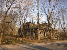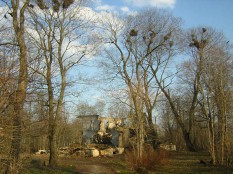 Парк запущен и символично заселен воронами, два дома - деревянный и полукаменный - в руинах. Тоска.